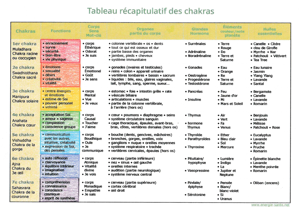 Voir le tableau ci-dessous pour l’ensemble des chakras.