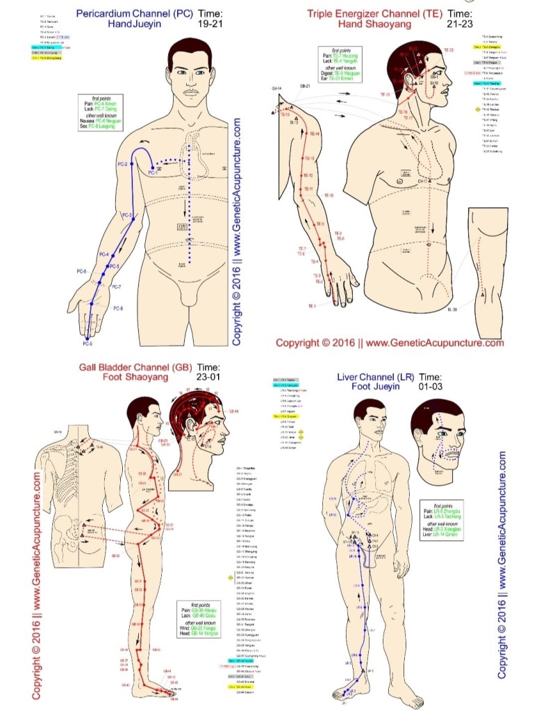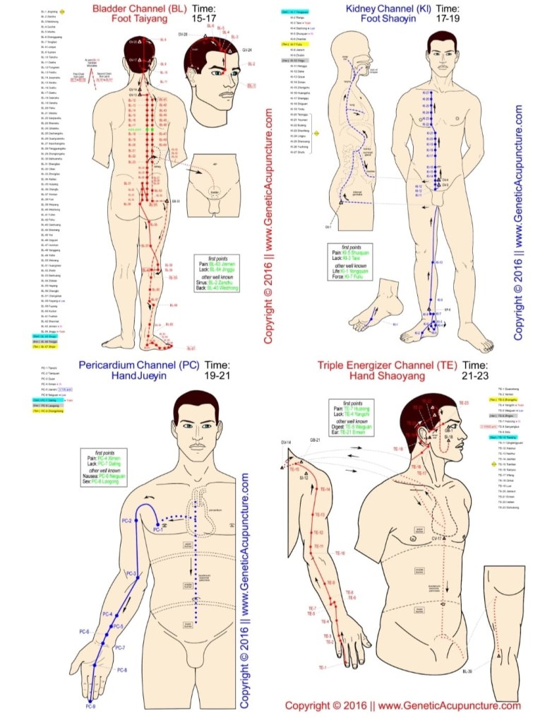 En MTC (Médecine Traditionnelle Chinoise) le corps est aussi composé de 12 méridiens principaux qui circulent de façon bilatérale. Tout comme les vaisseaux lymphatiques ou sanguins, ces méridiens possèdent des vaisseaux où circule l’énergie (le Qi) qui permet la circulation du sang et des liquides dans le corps.